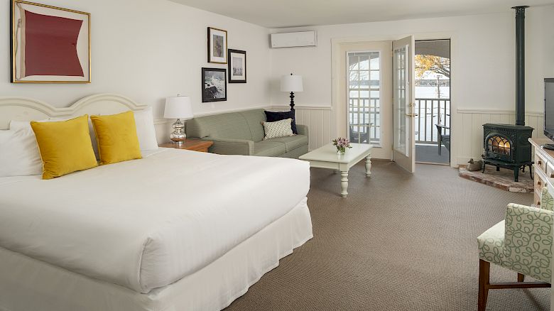 These recently updated guest rooms offer a “Maine Cottage” ambiance, with painted or knotty pine wainscoting, 21st century amenities and ample room to relax and enjoy the benefits of an extended-stay experience. The living room or sitting area is furnished with residential-style side chairs or a pull-out sofa and a gas fireplace. Amenities include LCD flat-screen television, complimentary Wi-Fi, refrigerator stocked with Poland Spring water, a Keurig coffee-maker with an assortment of Green Mountain coffee and tea and pillow top mattresses with crisp triple sheeting. The décor is accented with original art by renowned local artists and historical resort photography. The air-conditioned Lodges also offer private covered porches with traditional Adirondack or rocking chairs in Woodlandview, Partial Oceanview, Oceanview, or Oceanfront configurations.